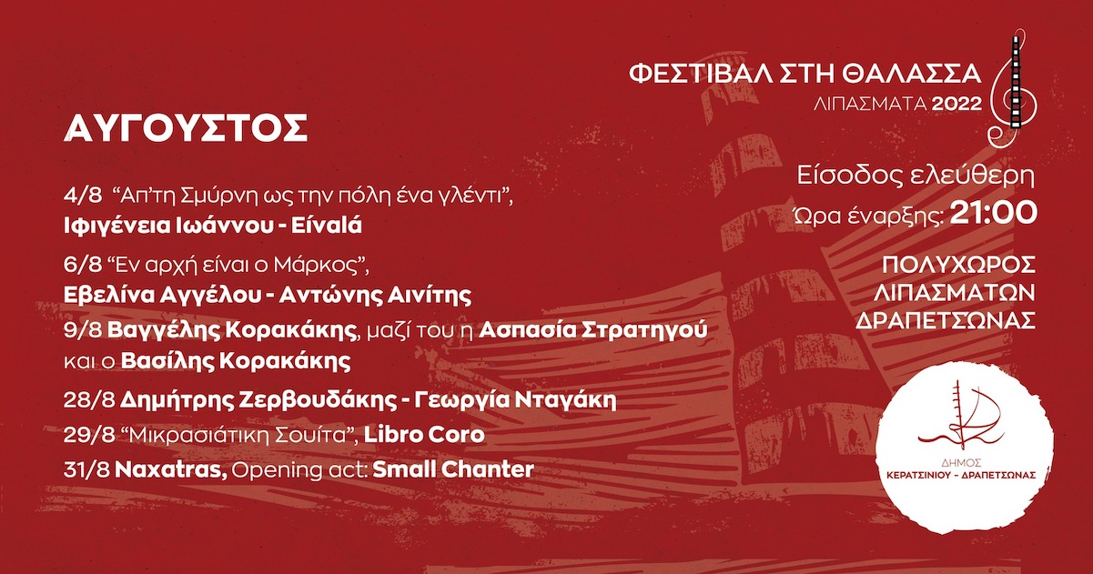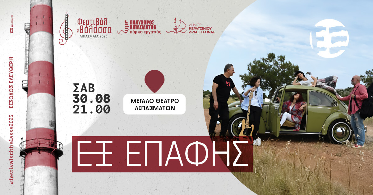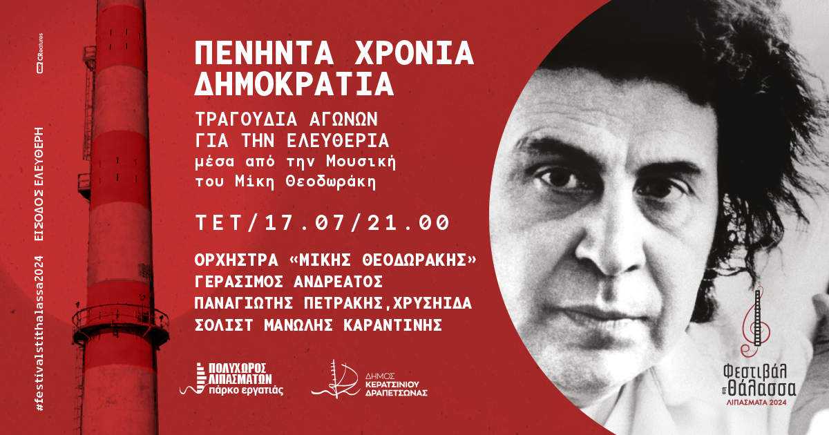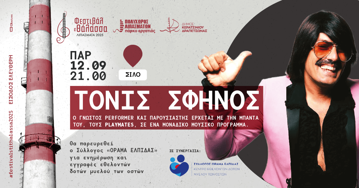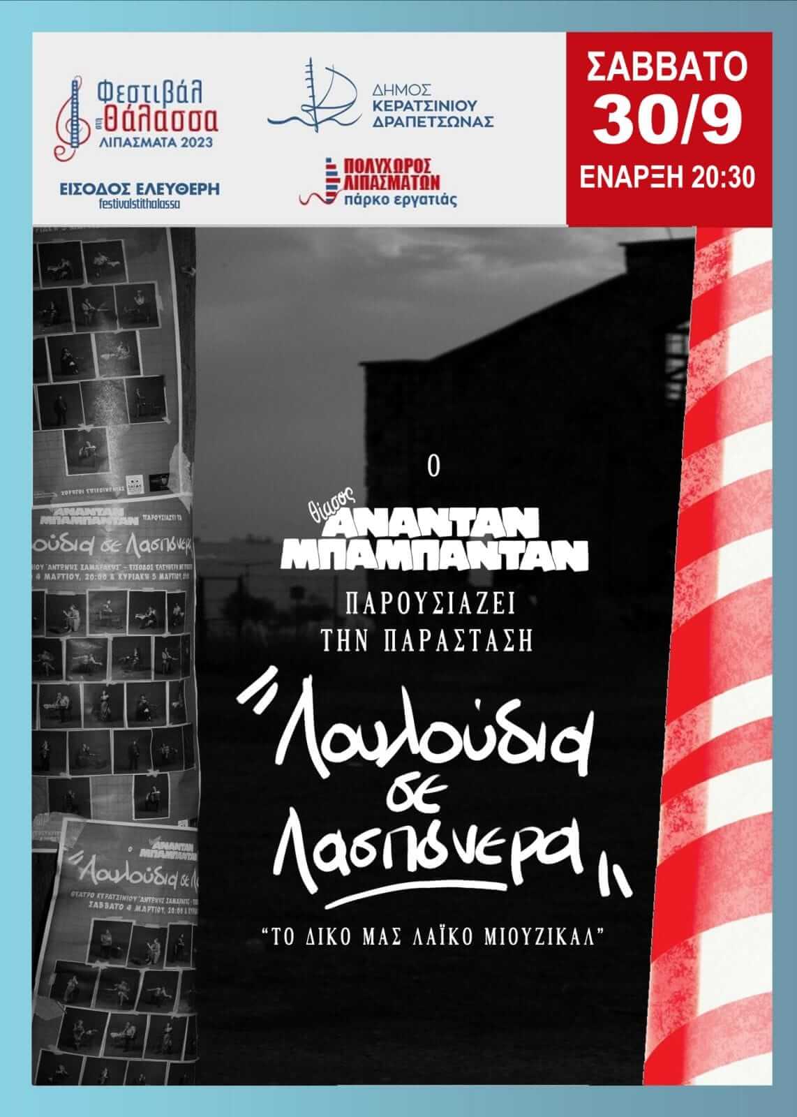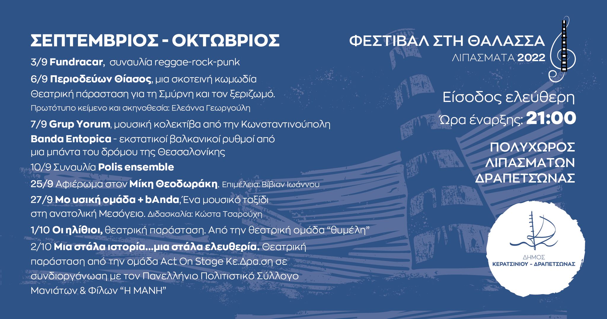Σε μια υπέροχη τοποθεσία, στον εμβληματικό και ιστορικό χώρο των Λιπασμάτων στη Δραπετσώνα, με τις διατηρητέες εγκαταστάσεις και τη χαρακτηριστική πανύψηλη καμινάδα, αλλά και τη θάλασσα που φτάνει σχεδόν ως την σκηνή, έχει καθιερωθεί ένας πολιτιστικός θεσμός από το 2017, το “Φεστιβάλ στη θάλασσα”.